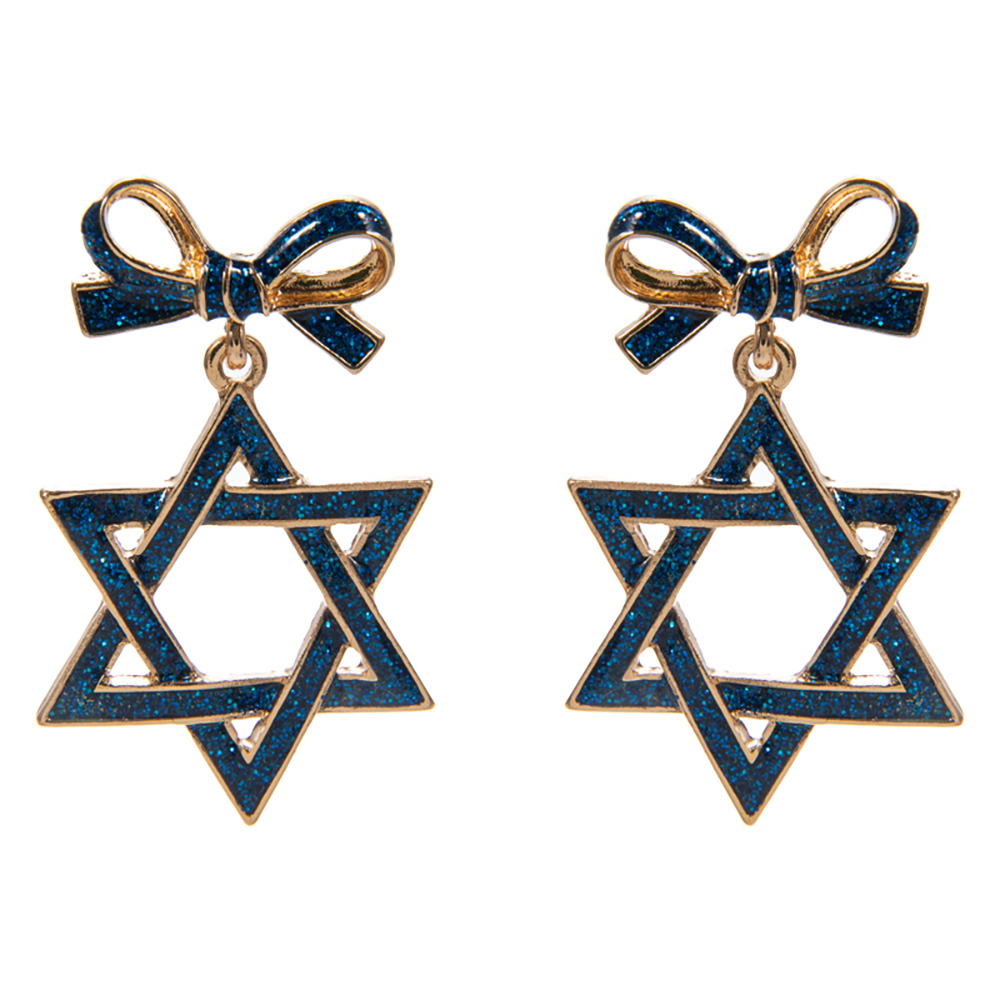 Details • Size : 1" X 1.75" • Titanium Post Back • Add charm and tradition to your look with these Star of David dangle earrings featuring sparkling bow accents. A meaningful accessory perfect for holidays, festive occasions, or daily wear, combining cultural symbolism with playful, elegant style. • Hypoallergenic • Lead and Nickel Compliant