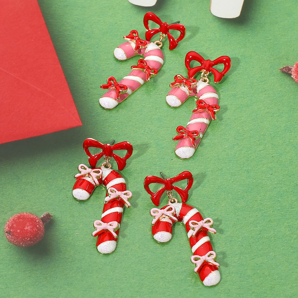 Details • Size : 0.8" X 2" • Post Back • Bring holiday cheer to your outfit with these candy cane bow earrings featuring striped detailing and charming bow accents. A fun and festive accessory, perfect for Christmas parties, seasonal gatherings, and adding a playful touch to your winter style. • Lead and Nickel Compliant