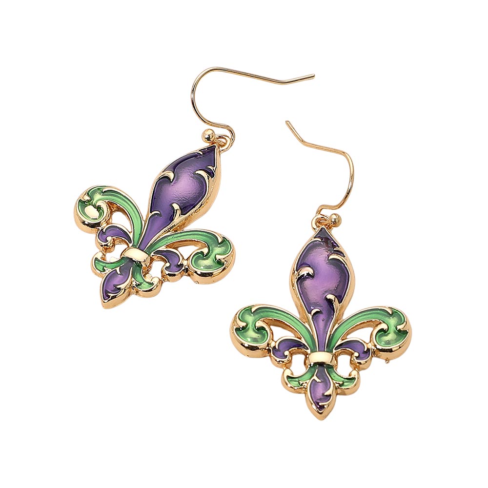 Details • Size : 1" X 1.75" • Fish Hook Back • Celebrate Mardi Gras in style with these intricate fleur-de-lis drop earrings. Their detailed enamel design and shimmering metallic finish make them a perfect festive accessory, adding a touch of elegance and carnival flair to any outfit or celebration. • Lead and Nickel Compliant