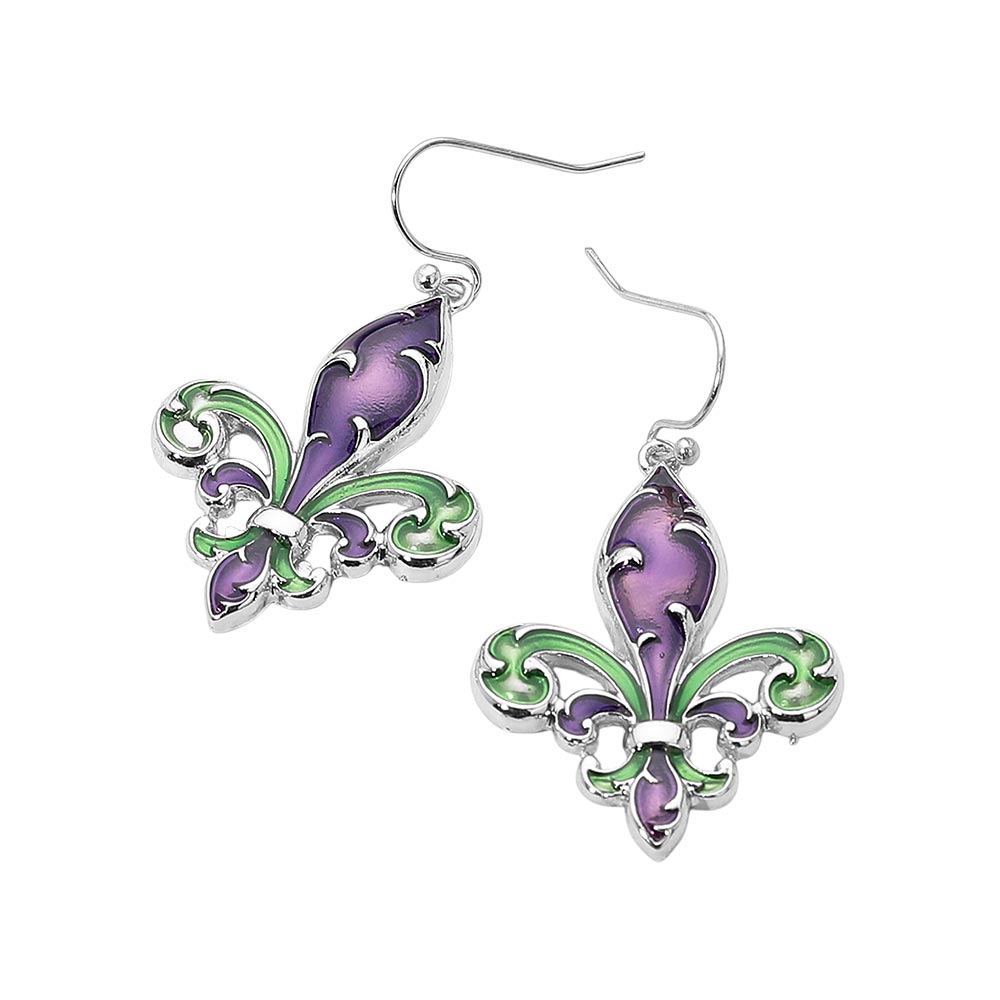 Enamel Mardi Gras Fleur de Lis Dangle Earrings