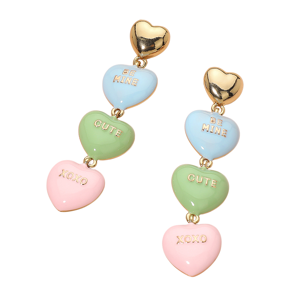 Details • Size : 0.6" X 2.75" • Post Back • Playful candy heart drop earrings featuring stacked heart charms with sweet message accents, a polished top heart stud, and a lightweight dangling design. A fun statement accessory that adds charm to everyday outfits, gifting, or themed looks. • Lead and Nickel Compliant
