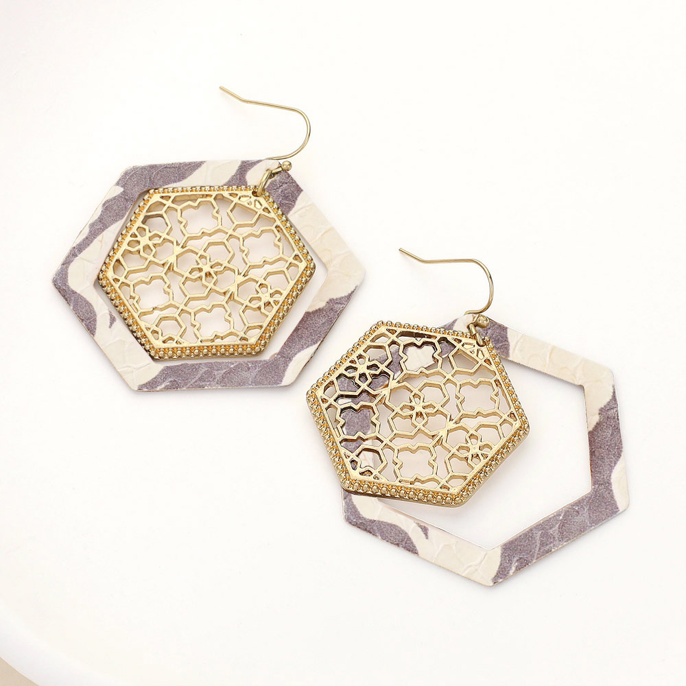 Details • Size : 1.75" X 2.25" • Fish Hook Back • Elevate your style with these hexagon drop earrings featuring a bold layered frame and delicate lace-inspired inner detail. Lightweight and versatile, they add modern elegance to both casual outfits and evening looks. • Lead and Nickel Compliant