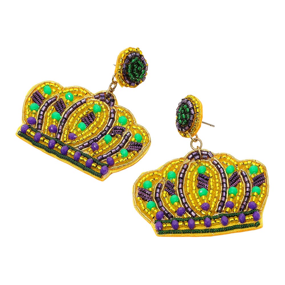Felt Back Seed Beaded Mardi Gras Crown Dangle Earrings