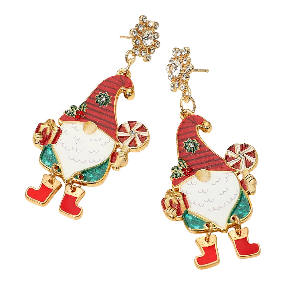 Details • Size : 1.4" X 3" • Post Back • Celebrate the season with these festive gnome dangle earrings, featuring a cheerful holiday design accented with sparkling details. Lightweight and eye-catching, they add playful charm to any outfit — perfect for parties, gatherings, or gifting to someone who loves holiday flair. • Lead and Nickel Compliant