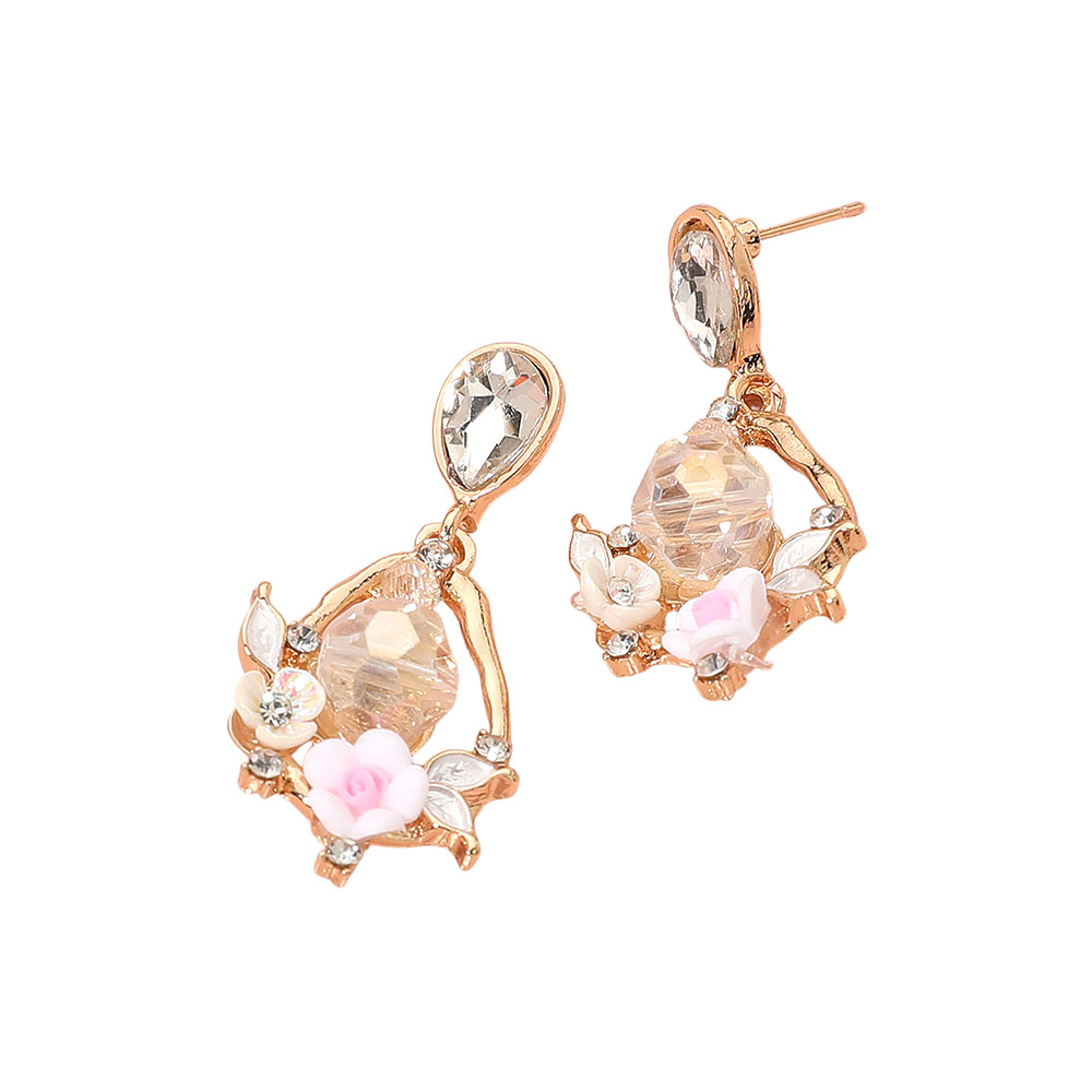 Floral Faceted Gem Embellished Teardrop Dangle Earrings