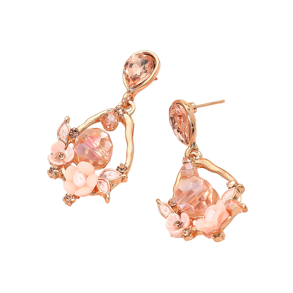 • Romantic drop earrings featuring faceted crystals framed in a floral-inspired setting with delicate rose and leaf accents. The intricate design and shimmering finish create a soft, elegant look—perfect for weddings, parties, or any refined occasion.