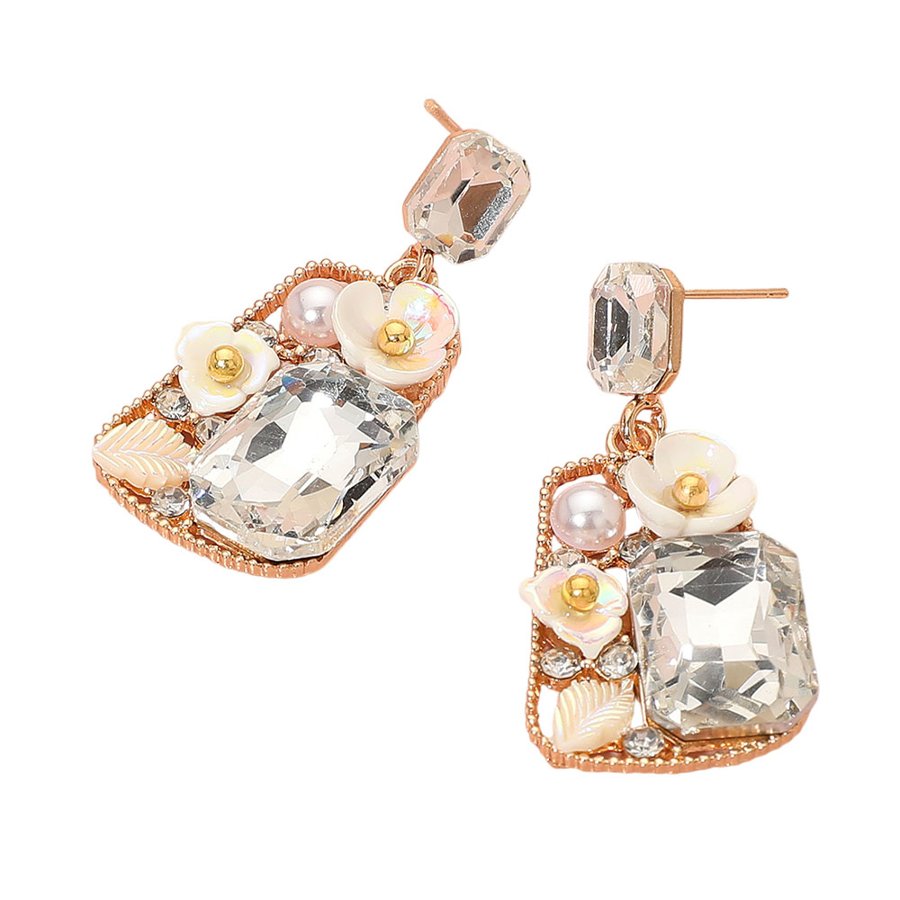 Floral Stone Pearl Leaf Accent Frame Dangle Earrings Floral Stone Pearl Leaf Accent Frame Dangle Earrings