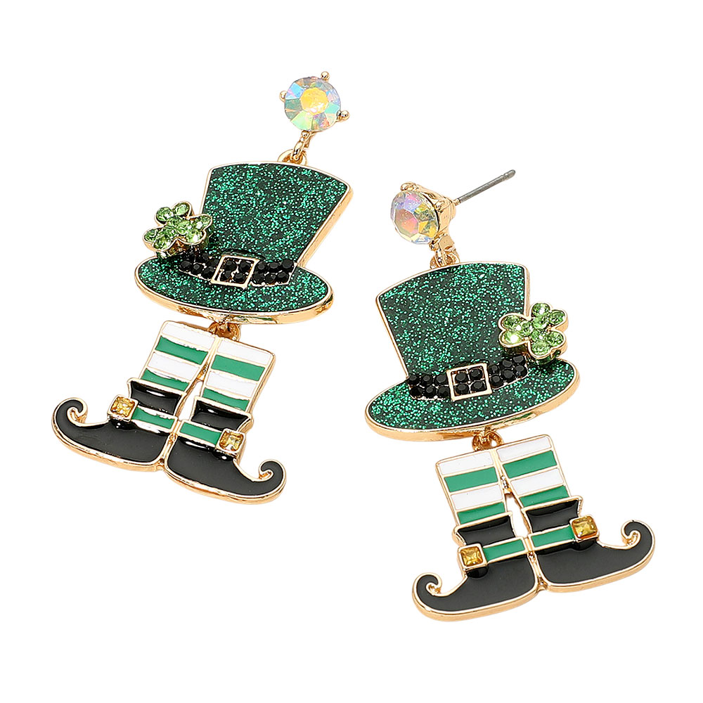 Details • Size : 1.1" X 2.3" • Post Back • Celebrate in style with these festive leprechaun hat and boots dangle earrings featuring sparkling accents and playful charm. Perfect for adding a fun, lucky touch to your outfit, they’re an eye-catching accessory ideal for parties, holidays, and cheerful occasions. • Lead and Nickel Compliant