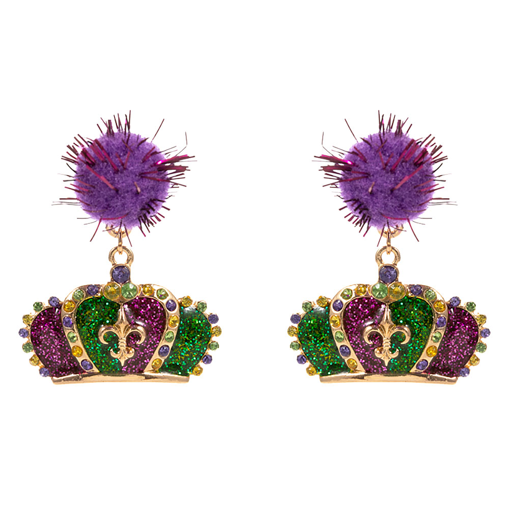 Details • Size : 1.25" X 1.5" • Titanium Post Back • Turn heads this carnival season with these Mardi Gras Crown Pom Pom Drop Earrings. Featuring sparkling crown charms and playful pom details, they perfectly capture the festive spirit, making them ideal for parades, parties, and themed celebrations. • Lead and Nickel Compliant • Hypoallergenic
