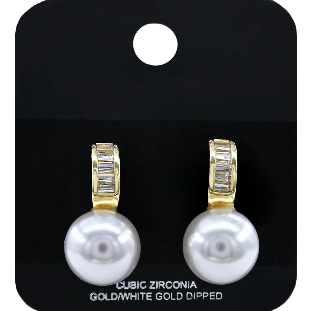 Details • Size : 0.5" X 0.9" • Post Back • These pearl drop earrings feature a graceful design enhanced with cubic zirconia accents for a refined sparkle. Perfect for formal occasions or everyday elegance, they combine timeless charm with modern sophistication, making them a versatile addition to any jewelry collection. • CZ Cubic Zirconia • Gold Dipped • Lead and Nickel Compliant