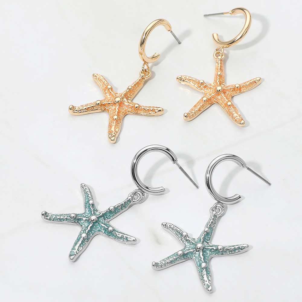 Details • Size : 1.1" X 1.75" • Charming starfish drop hoop earrings inspired by the ocean, perfect for adding a coastal touch to any outfit. Lightweight and stylish, these earrings are ideal for vacations, summer outings, or gifting to ocean lovers who enjoy nautical or beach-themed jewelry accessories. • Gold Dipped • Lead and Nickel Compliant • Sterling Silver Post