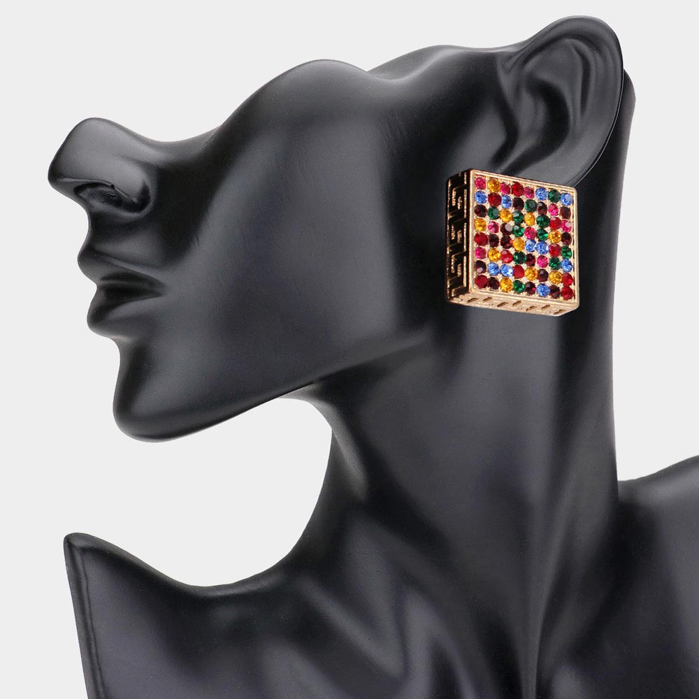 Details • Size : 1.2" X 1.2" • Post Back • Modern square stud earrings adorned with sparkling accents for a bold and elegant look. Their geometric design makes them perfect for both casual and formal outfits, offering a chic statement style that pairs seamlessly with dresses, blazers, or everyday wear for standout sophistication. • Lead and Nickel Compliant