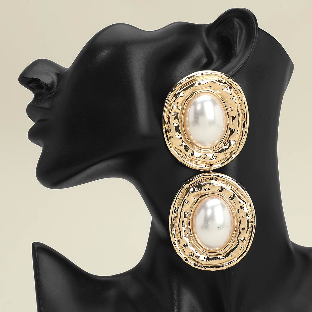 Details • Size : 1.8" X 4" • Post Back • Bold statement drop earrings designed with a hammered oval frame and a smooth pearl-style center for striking contrast and elegance. Lightweight yet eye-catching, these earrings add dramatic flair to evening looks, special occasions, or fashion-forward styling. Perfect for boutiques seeking standout, modern statement jewelry. • Lead and Nickel Compliant