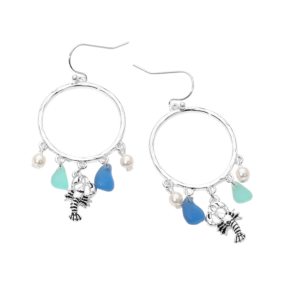 Lobster Sea Glass Charm Drop Open Ring Dangle Earrings