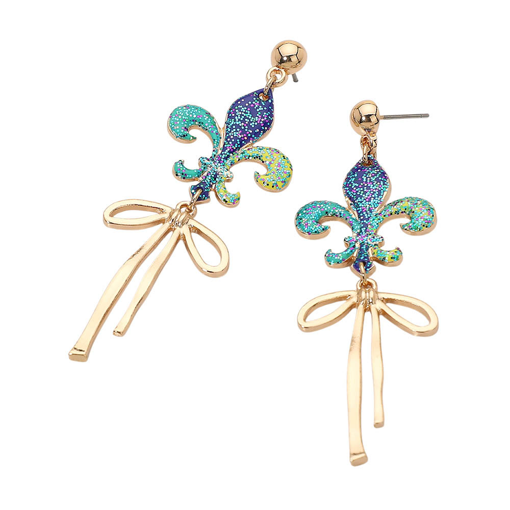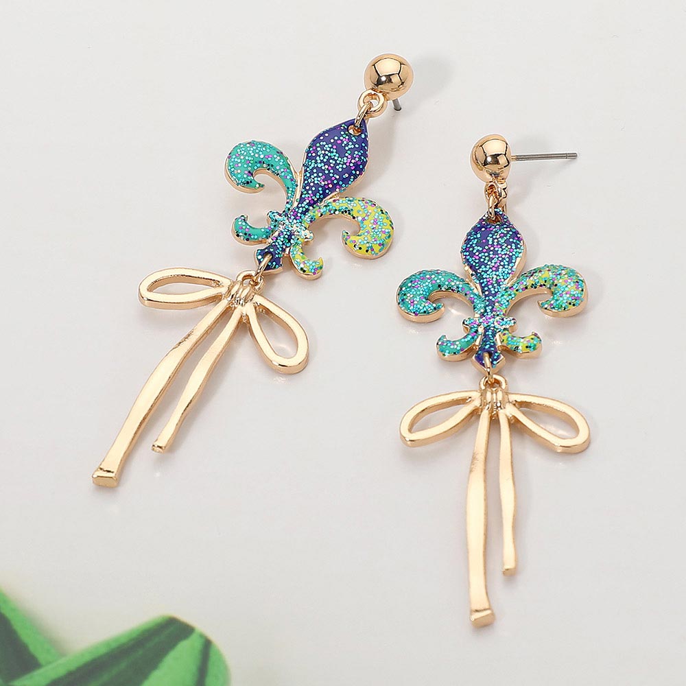 Details • Size : 0.8" X 2.75" • Post Back • Eye-catching fleur-de-lis drop earrings accented with flowing ribbon-style dangles for graceful movement and bold impact. A striking accessory ideal for festive events, themed outfits, parties, parades, and statement styling that adds elegant charm and standout appeal to any jewelry display. • Lead and Nickel Compliant