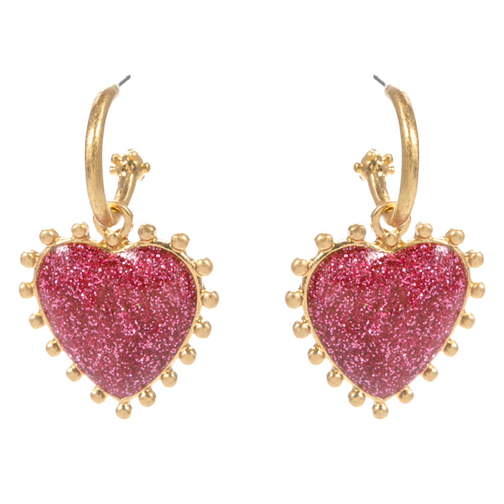 Details • Size : 1" X 1.6" • Titanium Post Back • Chic heart hoop earrings featuring a glitter accent and beaded edge for a playful yet elegant look. Perfect for adding sparkle to everyday outfits or special occasions, these earrings bring charm and shine, making them a stylish choice for festive or romantic wear. • Hypoallergenic • Lead and Nickel Compliant