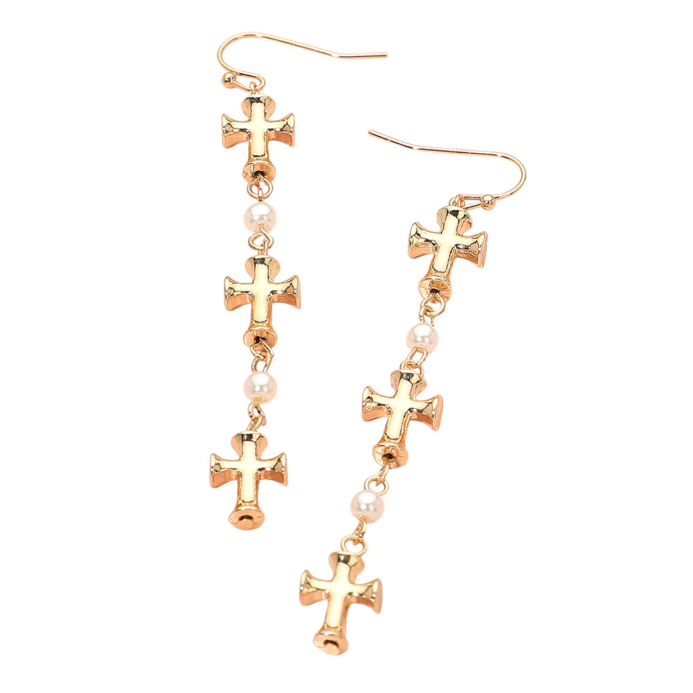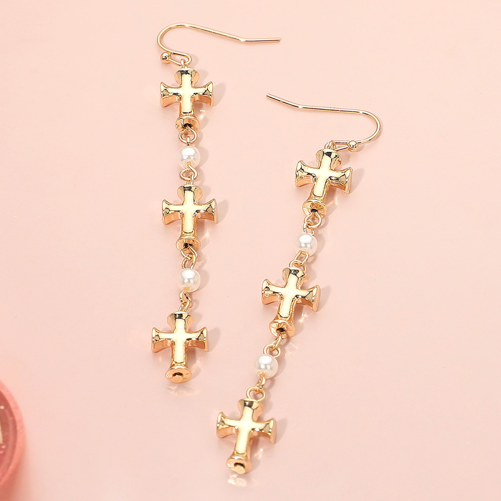 Details • Size : 0.4" X 3.1" • Fish Hook Back • These cross drop earrings feature a graceful cascading design adorned with delicate bead accents for a timeless and refined look. Perfect for elevating both casual and dressy outfits, they bring a subtle statement of style and elegance to any occasion. • Lead and Nickel Compliant