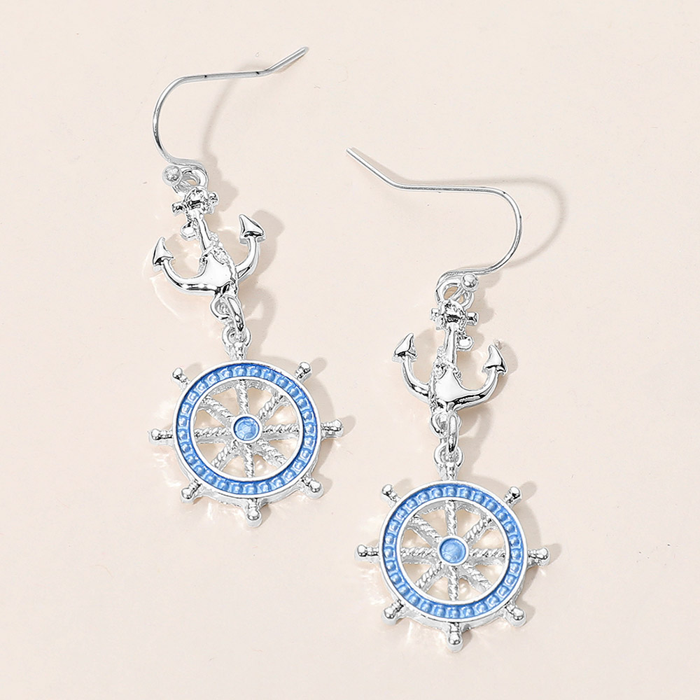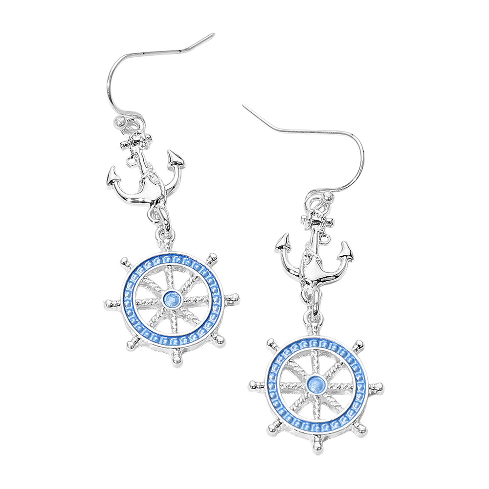 Details • Size : 0.75" X 1.8" • Fish Hook Back • Statement dangle earrings featuring a nautical anchor and ship wheel design. Perfect for coastal themes, beach shops, and summer collections, these lightweight earrings add playful movement and ocean-inspired charm to everyday outfits, vacation looks, and seasonal accessory displays. • Lead and Nickel Compliant