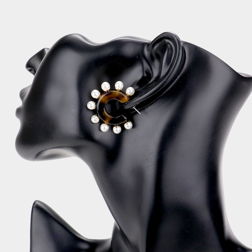 Pearl Detail Celluloid Acetate Tortoise Half Hoop Earrings