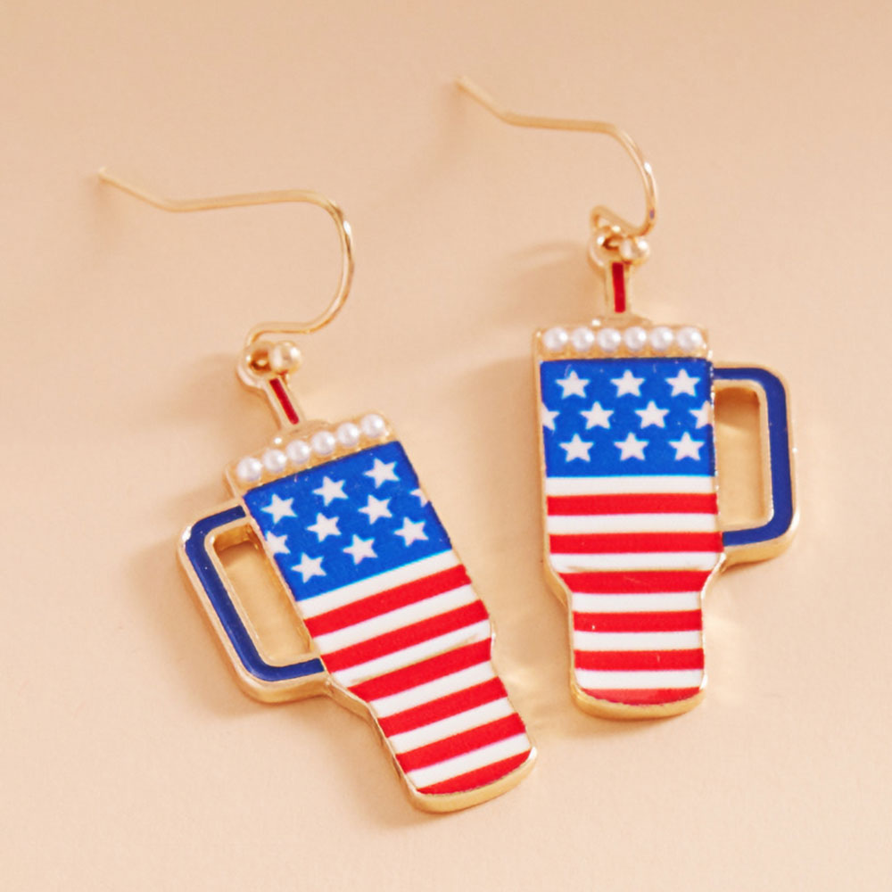Pearl Embellished Enamel American USA Flag Tumbler Dangle Earrings
