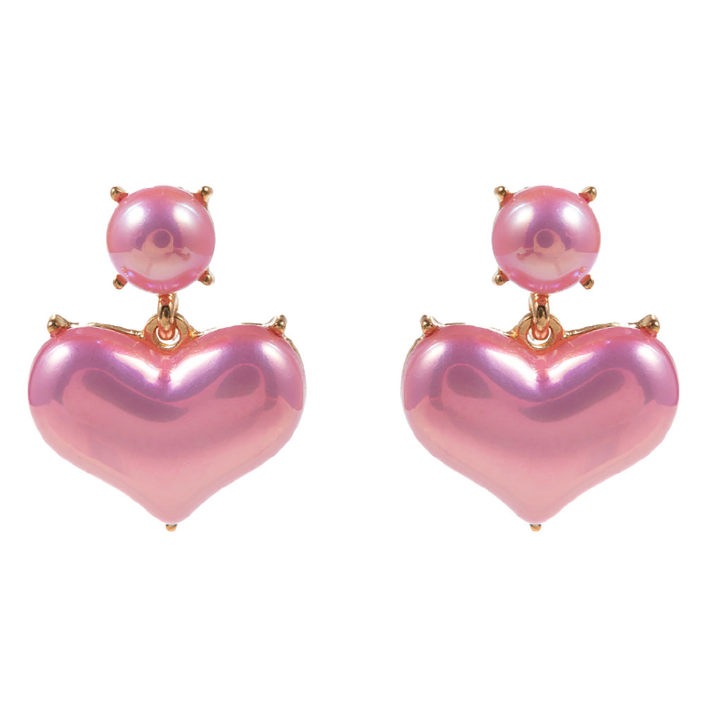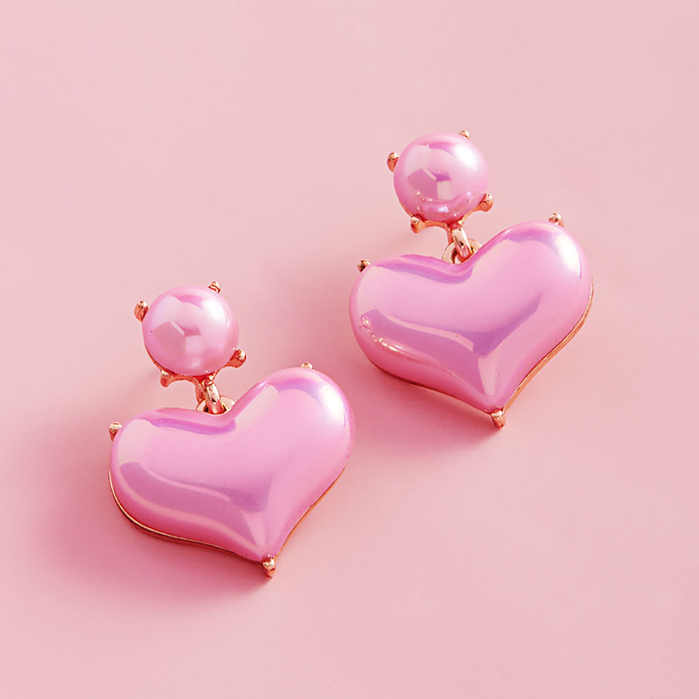 • Add a soft, romantic glow to your look with these Iridescent Heart Drop Earrings. Featuring lustrous heart and pearl accents in a sleek statement design, these earrings bring a touch of elegance and charm to any outfit, perfect for date nights or special occasions.