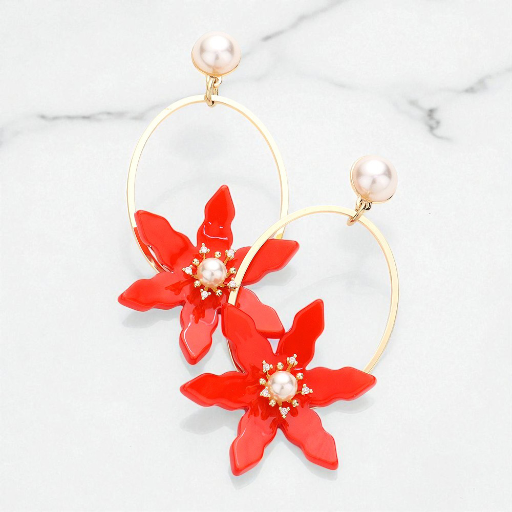 Pearl Pointed Resin Flower Accented Open Metal Oval Dangle Earrings
