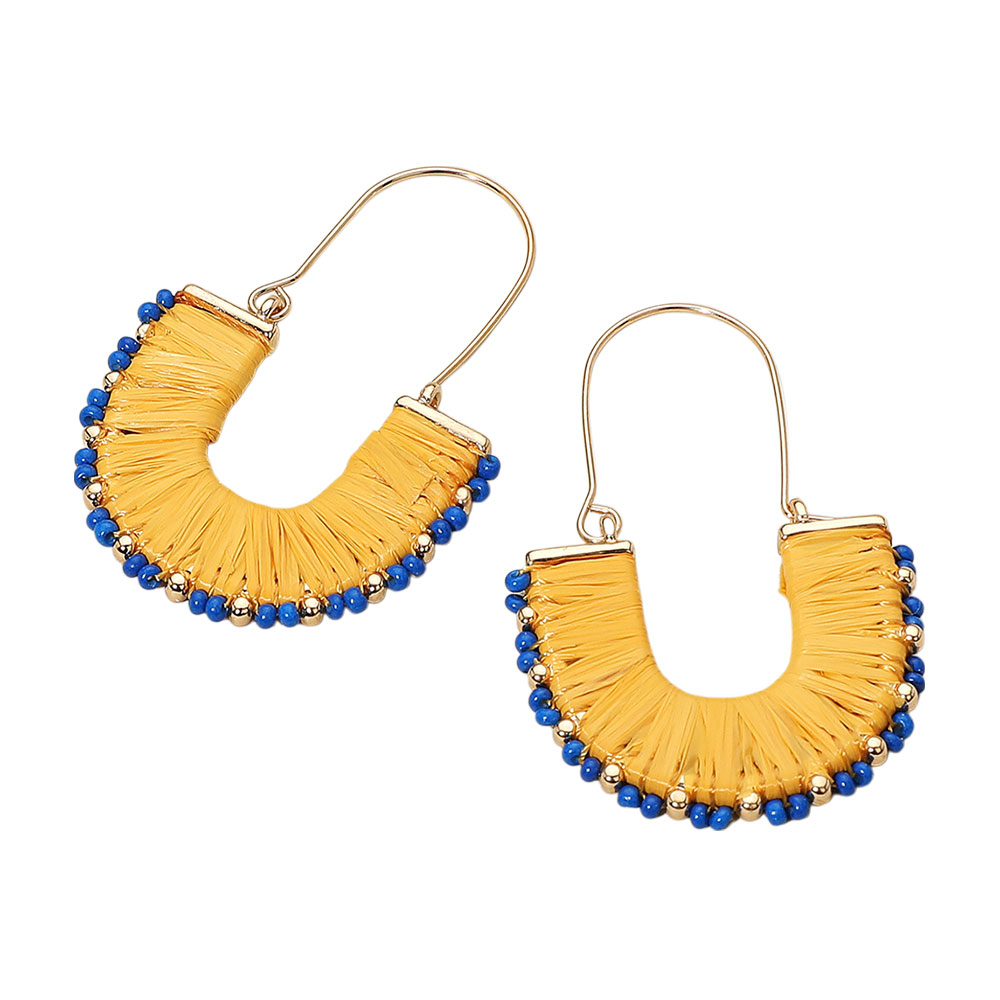 Details • Size : 1.3" X 2" • Kidney Wire Closure • Add playful elegance to your look with raffia wrapped hoop earrings accented by a beaded trim. Bold yet lightweight, these unique earrings blend vibrant texture with modern style, making them a standout accessory for casual outfits, vacations, or festive occasions. • Lead and Nickel Compliant