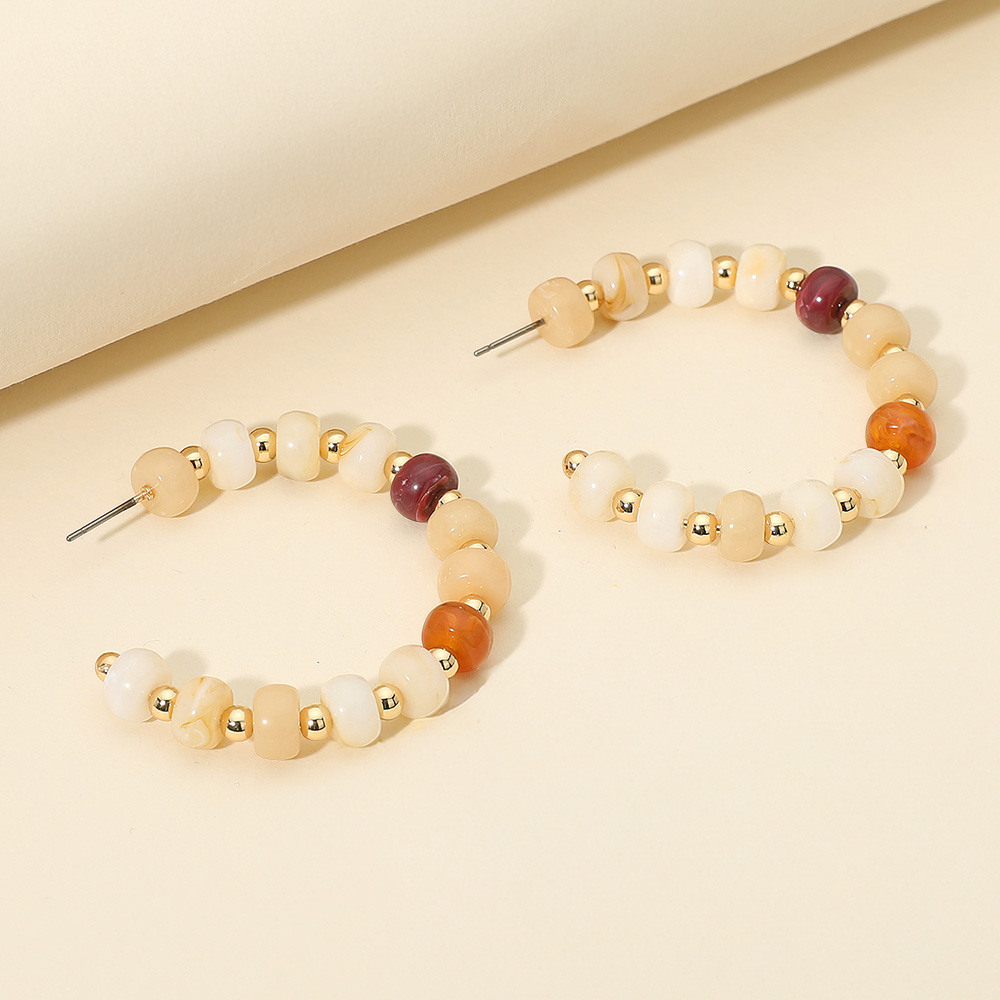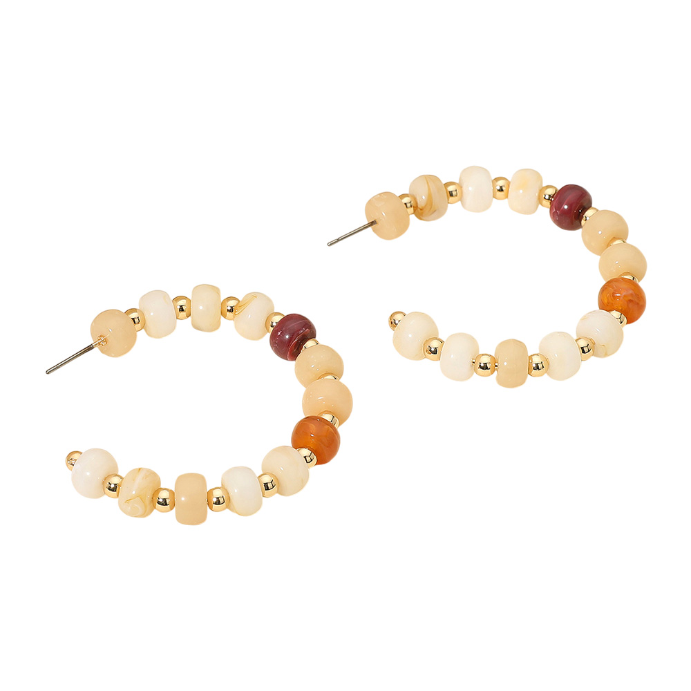 Details • Size : 2" X 2" • Post Back • Stylish beaded hoop earrings featuring glossy resin beads and gold-tone accents. Lightweight and comfortable for daily wear, these trendy hoops add a warm, modern touch to any outfit. Perfect for casual looks or gifting. • Lead and Nickel Compliant