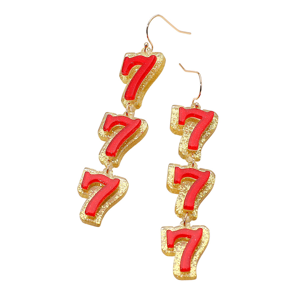 Details • Size : 1" X 2" • Fish Hook Back • Add a playful sparkle to your look with these Lucky Seven drop earrings. Featuring bold number charms that cascade in a fun, eye-catching design, they bring charm and confidence to any outfit. Perfect for parties, festivals, or anyone who loves a statement piece with personality. • Lead and Nickel Compliant