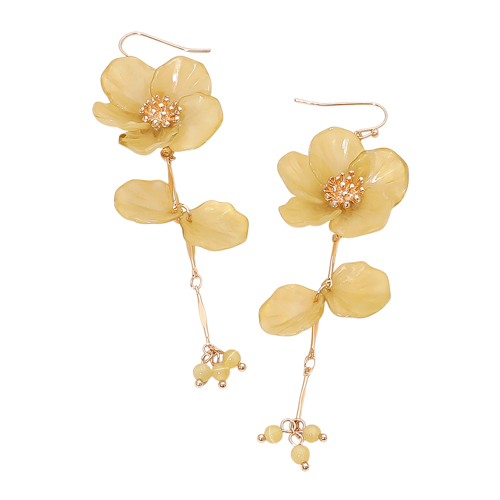 Details • Size : 1.25" X 3.75" • Fish Hook Back • Elegant long drop earrings featuring layered floral petals and delicate clustered accents for a soft, romantic look. Perfect for weddings, parties, garden events or adding graceful botanical charm to everyday style with their airy, feminine movement. • Lead and Nickel Compliant