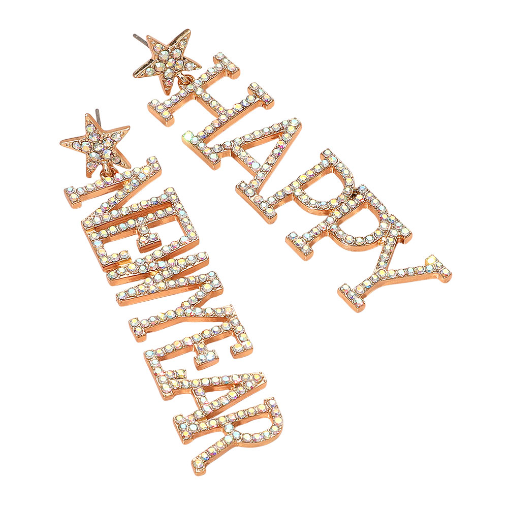 Details • Siez : 0.7" X 3" • Post Back • Celebrate in style with these dazzling Happy New Year statement earrings featuring sparkling letter accents and festive star details. Perfect for ringing in the new year with glam and confidence, these earrings add radiant shine to your party look all night long. • Lead and Nickel Compliant