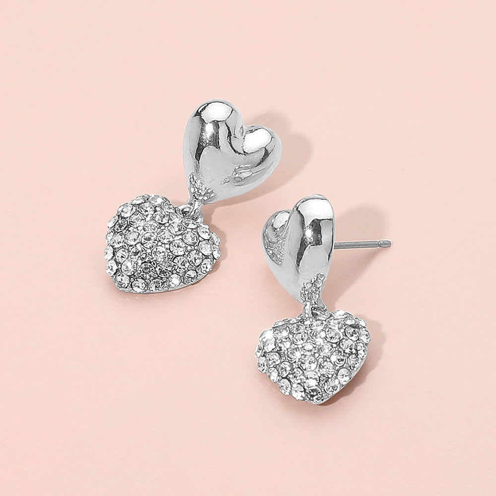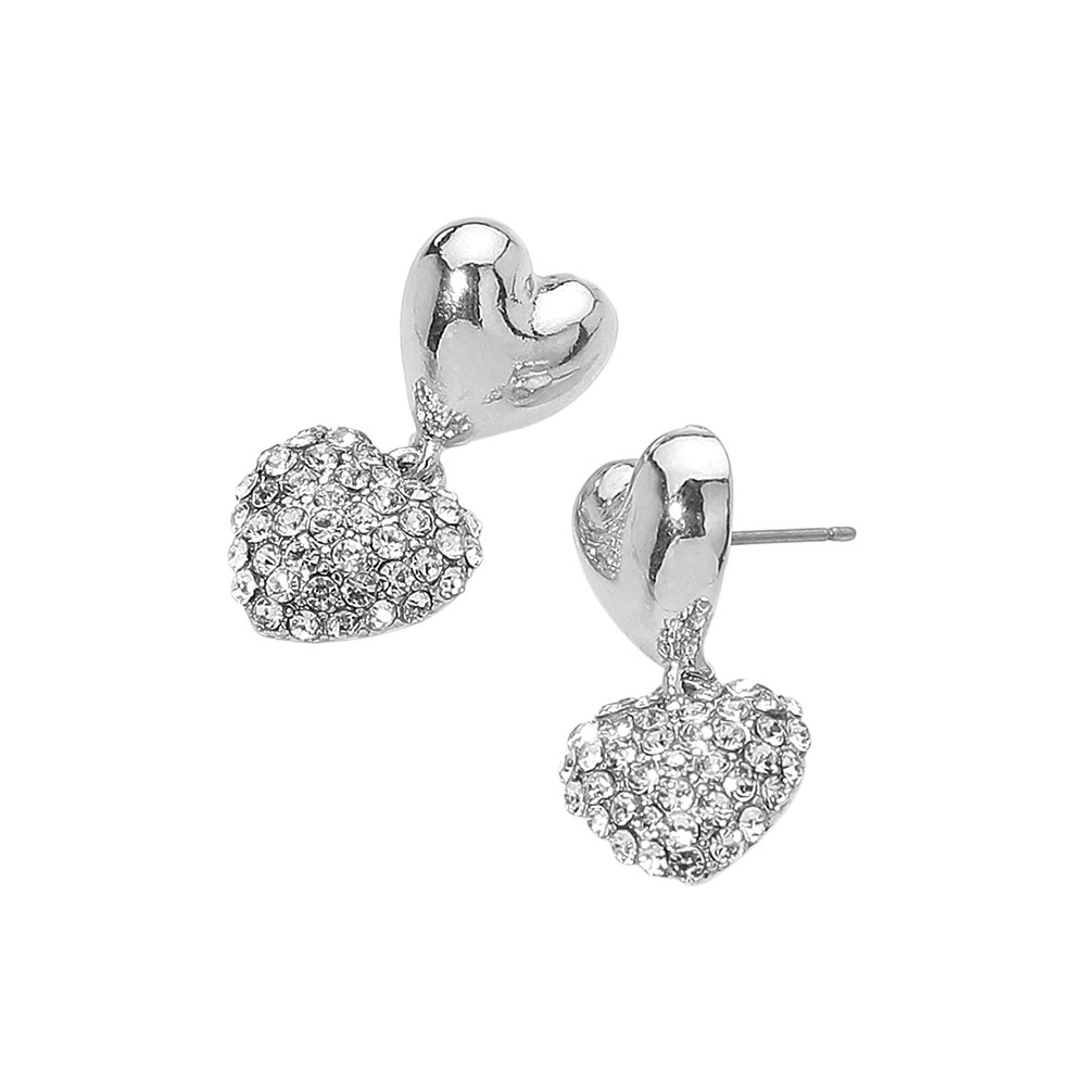 Details • Size : 0.5" X 1.2" • Post Back • Add a touch of romance with these sparkling double heart earrings, featuring a sleek metallic top heart and a dazzling crystal-accented lower heart. Perfect for day-to-night wear, they bring elegant charm and a playful shimmer to your style effortlessly. • Lead and Nickel Compliant
