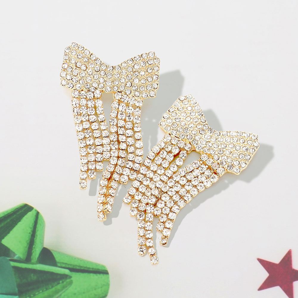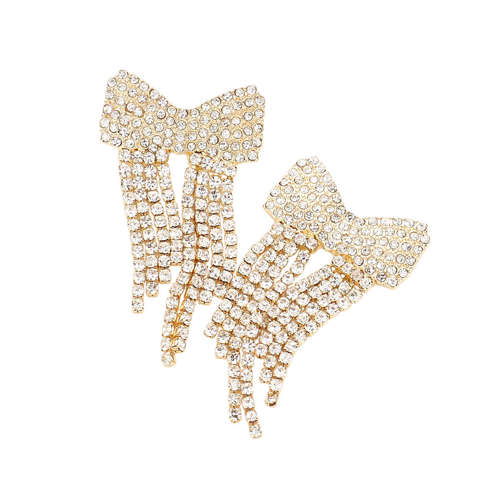 Details • Size : 1.1" X 2.1" • Post Back • Add timeless glamour with these rhinestone bow earrings featuring a cascading fringe design. Ideal for elegant events or festive nights out, they bring movement, brilliance, and charm to your accessory collection. • Lead and Nickel Compliant