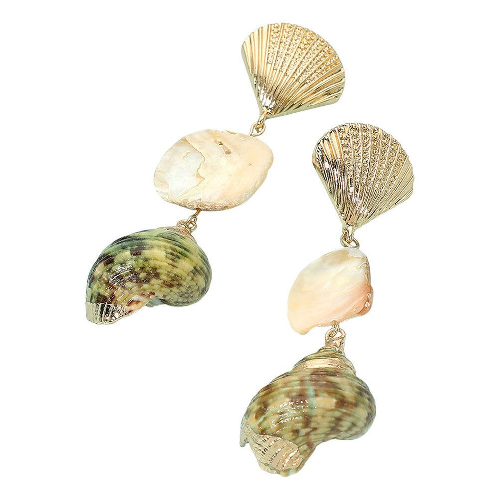 Details • Size : 1" X 3.5" • Post Back • Seashell drop earrings featuring layered shell details and textured tops, perfect for adding coastal-inspired charm. Lightweight and stylish, these earrings bring a breezy, beach-ready look to any outfit. Ideal for summer vacations, resort wear, or casual seaside gatherings. • Lead and Nickel Compliant