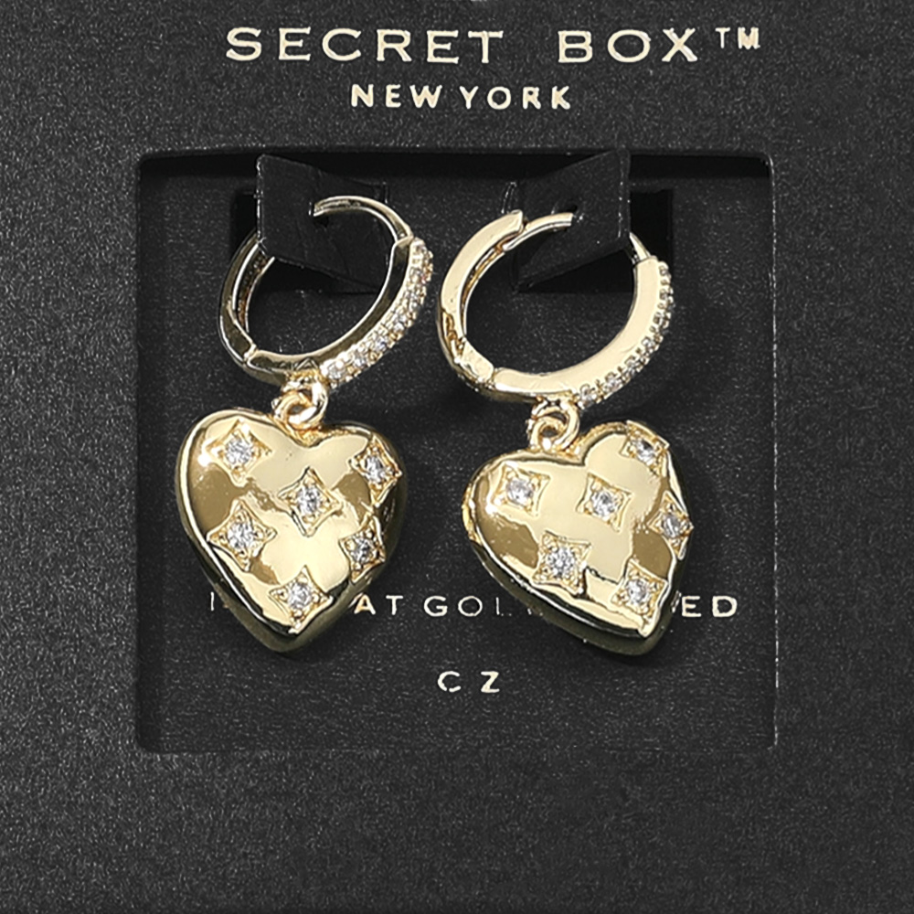 SECRET BOX_14K Gold Dipped CZ Stone Paved Heart Dangle Huggie Earrings