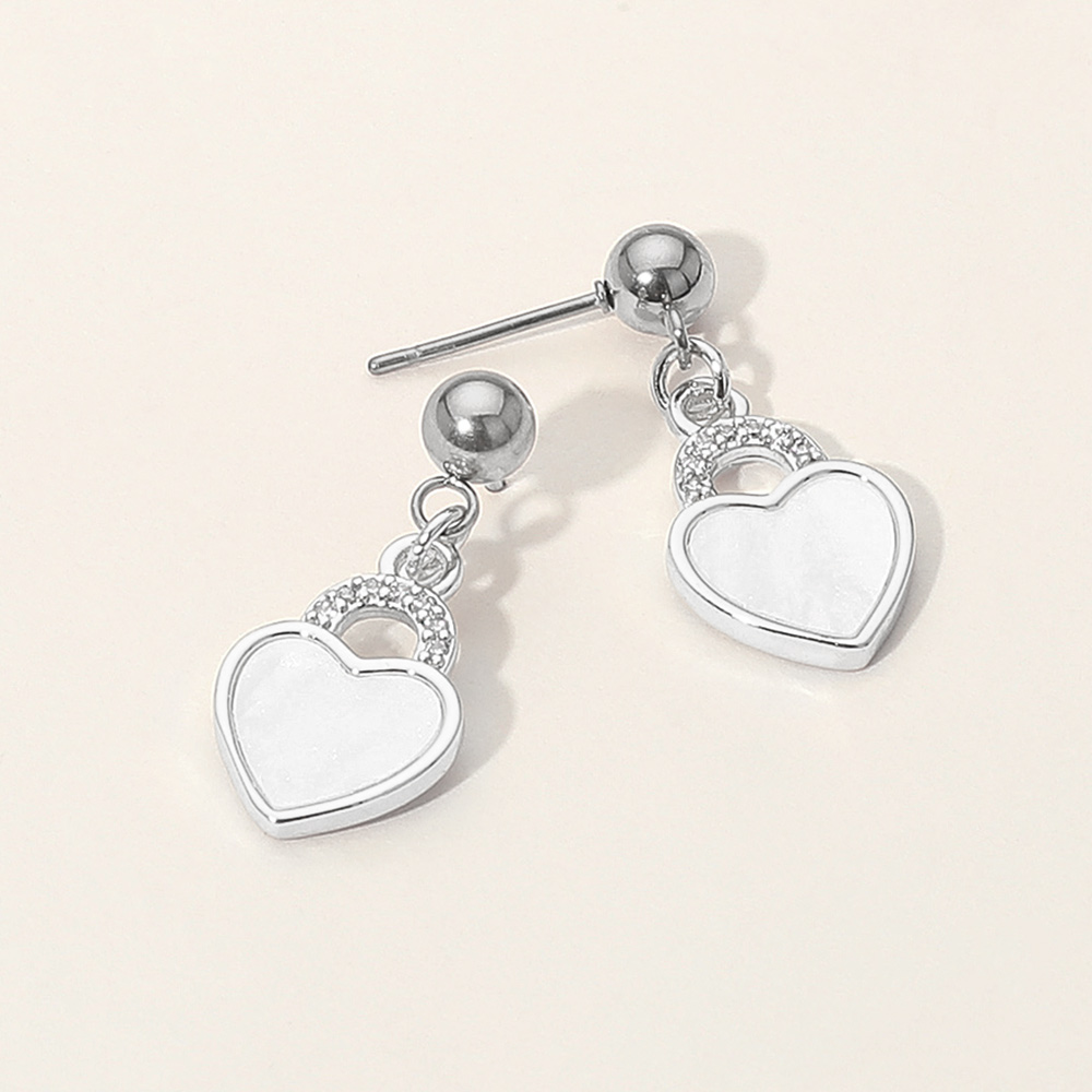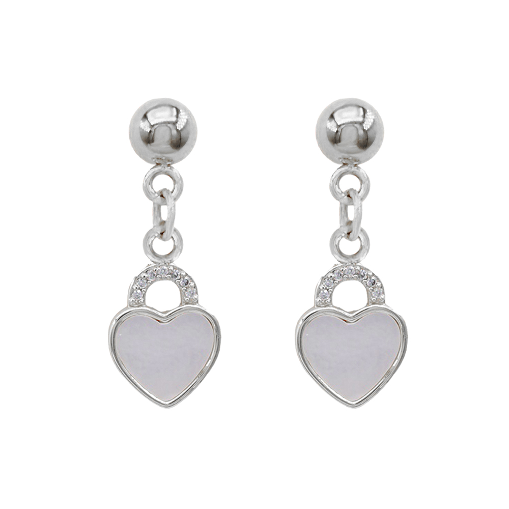 Stainless Steel CZ Stone Accent Mother of Pearl Heart Charm Dangle Earrings