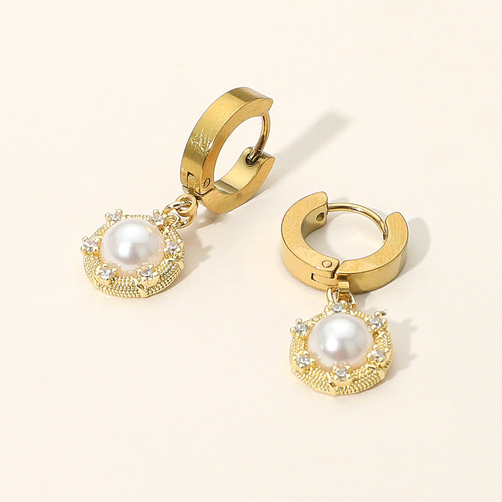Stainless Steel CZ Stone Rim Pearl Charm Dangle Huggie Earrings