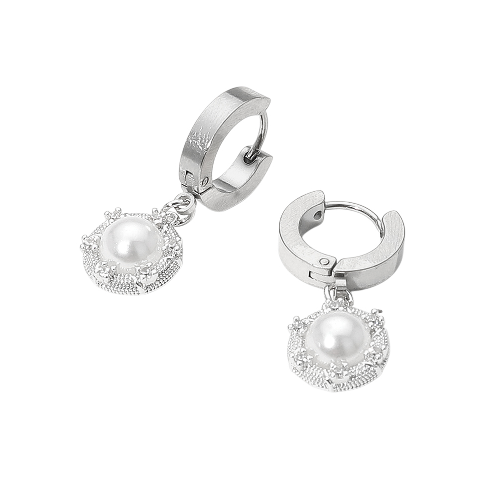 Stainless Steel CZ Stone Rim Pearl Charm Dangle Huggie Earrings