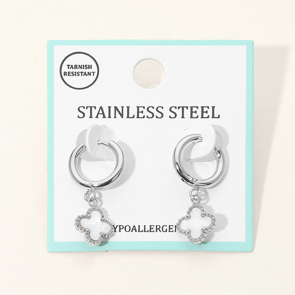 Stainless Steel Mother of Pearl Quatrefoil Charm Drop Dangle Huggie Hoop Earrings