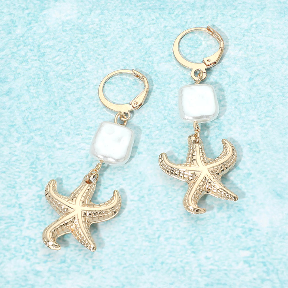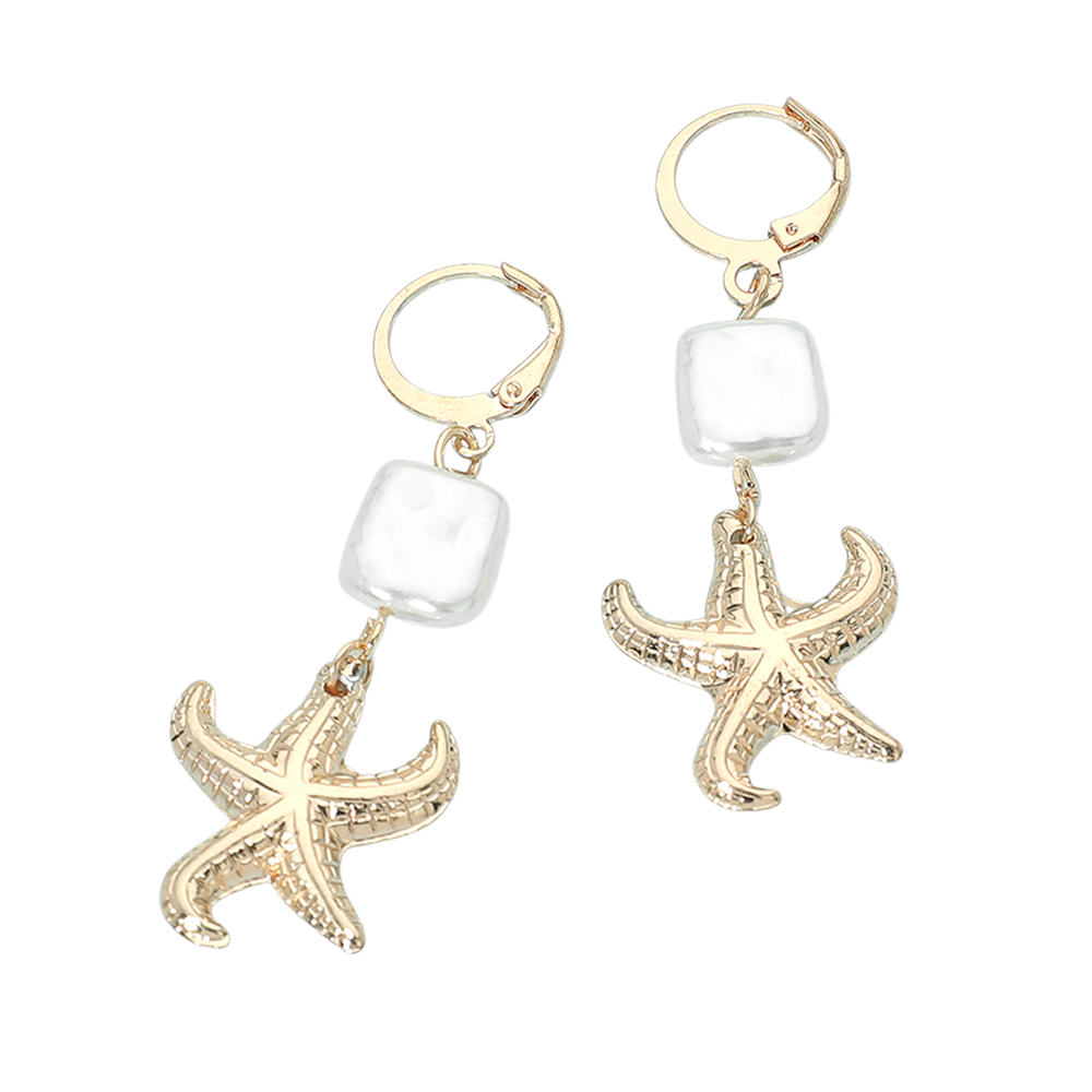 Details • Size : 0.75" X 2.1" • Huggie Back • Playful drop earrings featuring a starfish charm paired with a smooth geometric accent for a relaxed yet polished look. Designed to move beautifully with every step, this style is ideal for summer outfits, resort wear, beach-inspired collections, and giftable jewelry displays for boutiques and online shops. • Lead and Nickel Compliant
