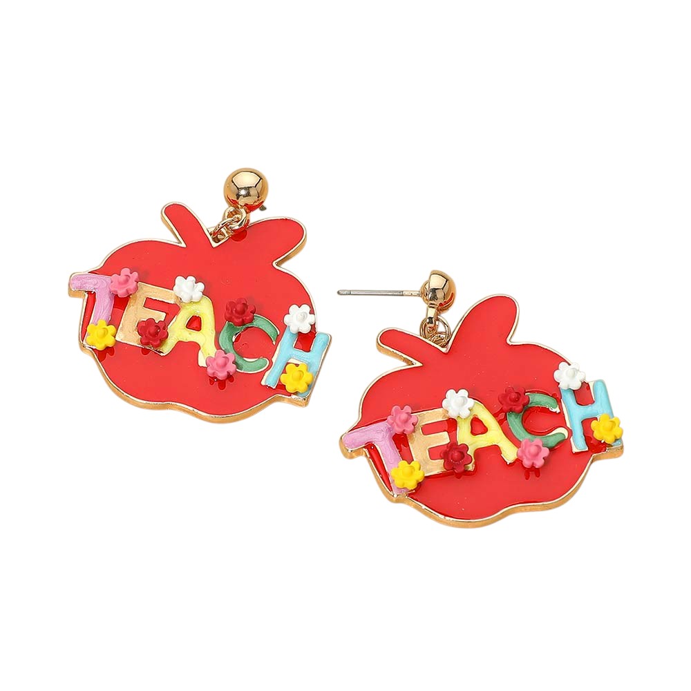 Details • Size : 1.5" X 1.5" • Post Back • These teacher apple word drop earrings feature playful lettering with dimensional accents and a lightweight drop design that adds charm and movement. Ideal for classroom style, appreciation gifts, seasonal displays, and themed collections, they bring a fun statement look while remaining comfortable for all-day wear. • Lead and Nickel Compliant