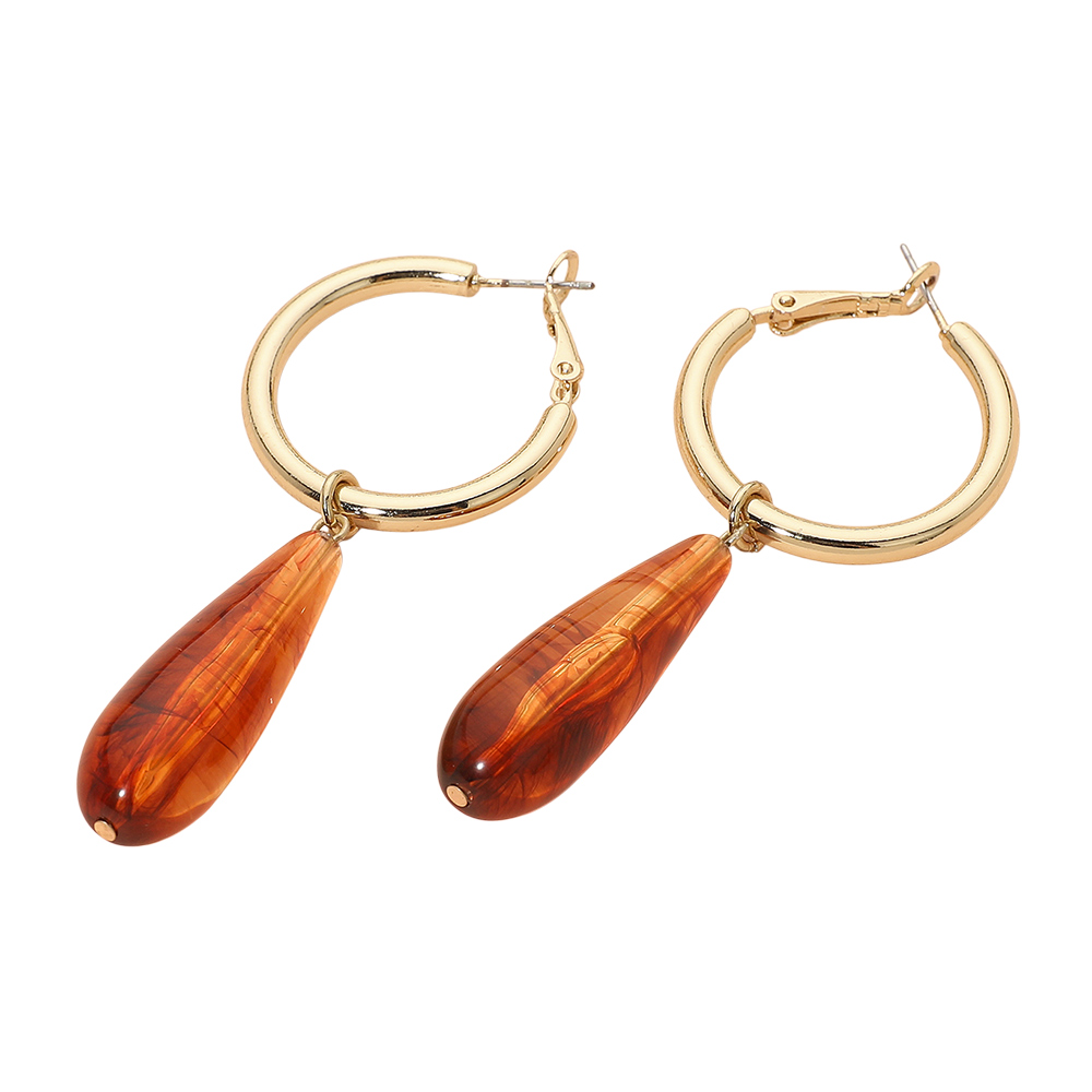 Details • Size : 1.25" X 2.75" • Omega Back • These teardrop drop hoop earrings showcase a warm tortoise-style accent suspended from a sleek hoop, creating an elegant, eye-catching silhouette. Their fluid shape adds movement and charm, making them a standout accessory that elevates both everyday outfits and dressy looks. • Lead and Nickel Compliant