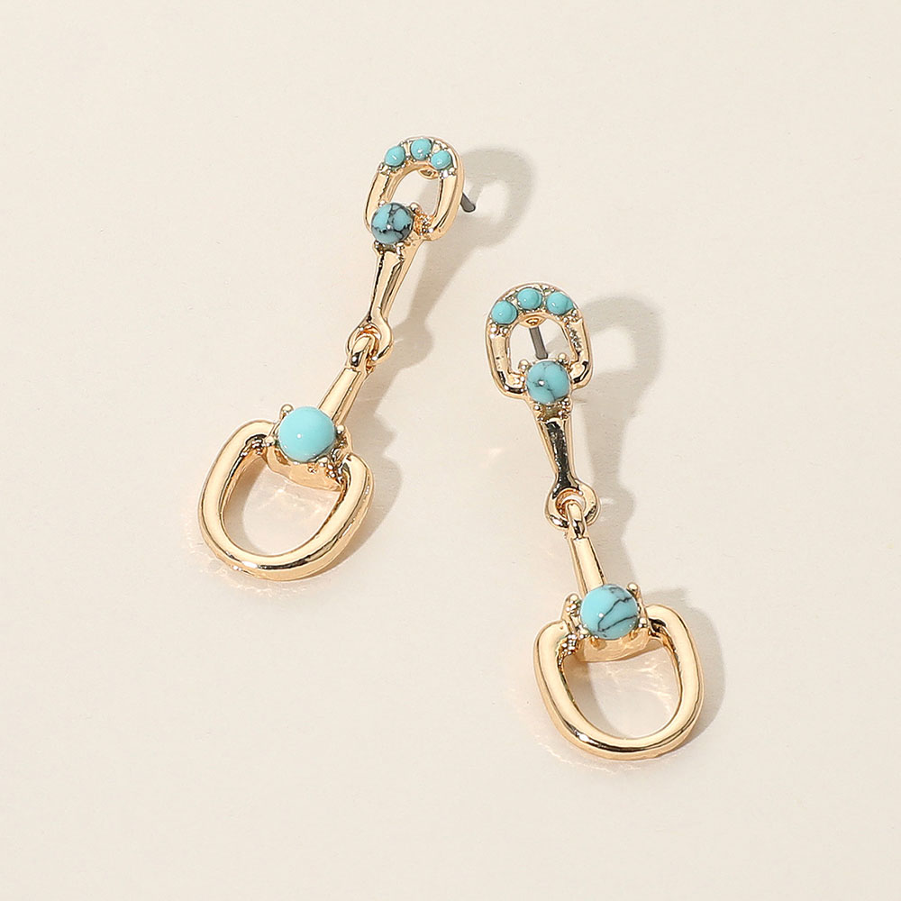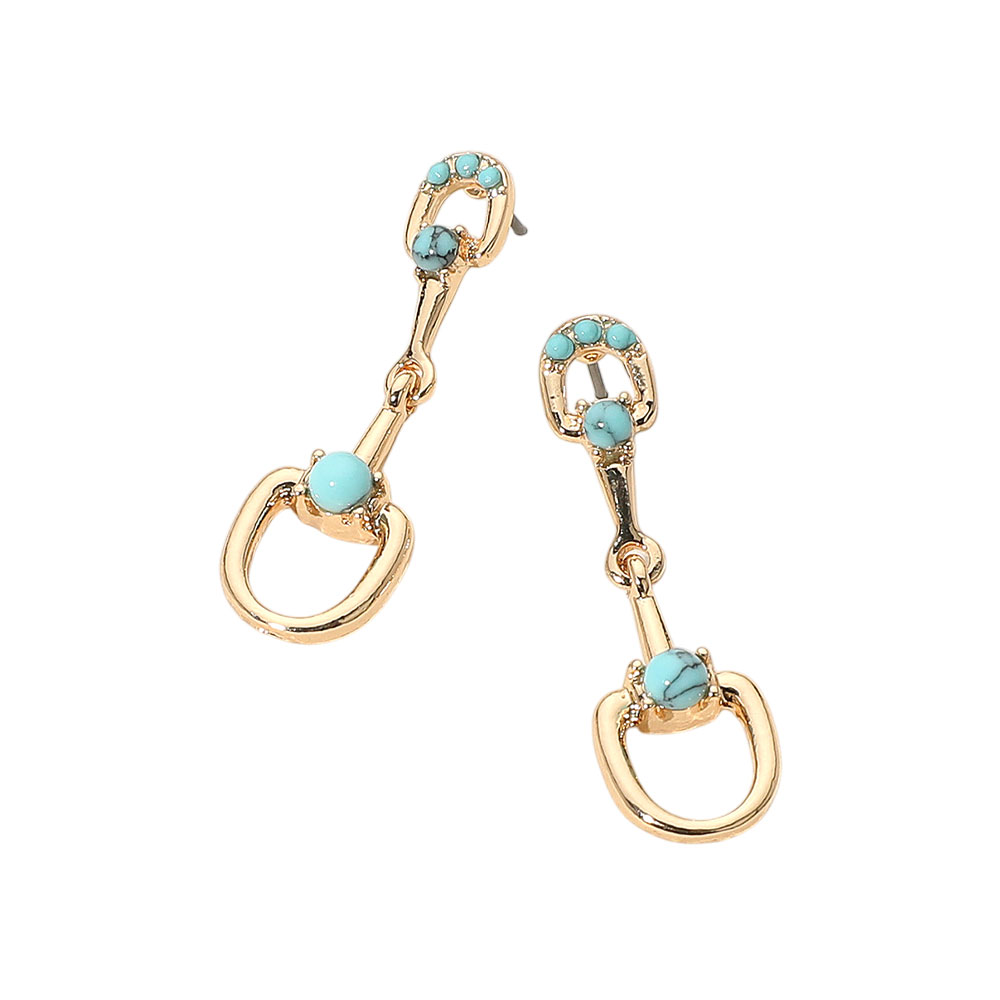 Details • Size : 0.4" X 1.5" • Post Back • Stylish Western-inspired dangle earrings with turquoise-style accents and gold-tone detailing. Perfect for adding rustic charm and modern elegance to any look. Lightweight and versatile for casual or dressy wear. • Lead and Nickel Compliant