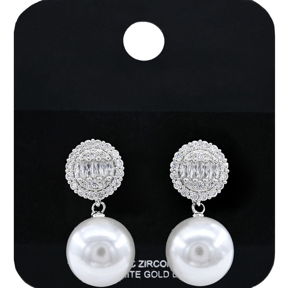 Details • Size : 0.5" X 0.9" • Post Back • Discover exquisite cubic zirconia and pearl drop earrings featuring a radiant halo design with baguette accents. Perfect for weddings, parties, or daily elegance, these lightweight earrings add timeless charm and sophistication to any look. • CZ Cubic Zirconia • Gold Dipped • Lead and Nickel Compliant