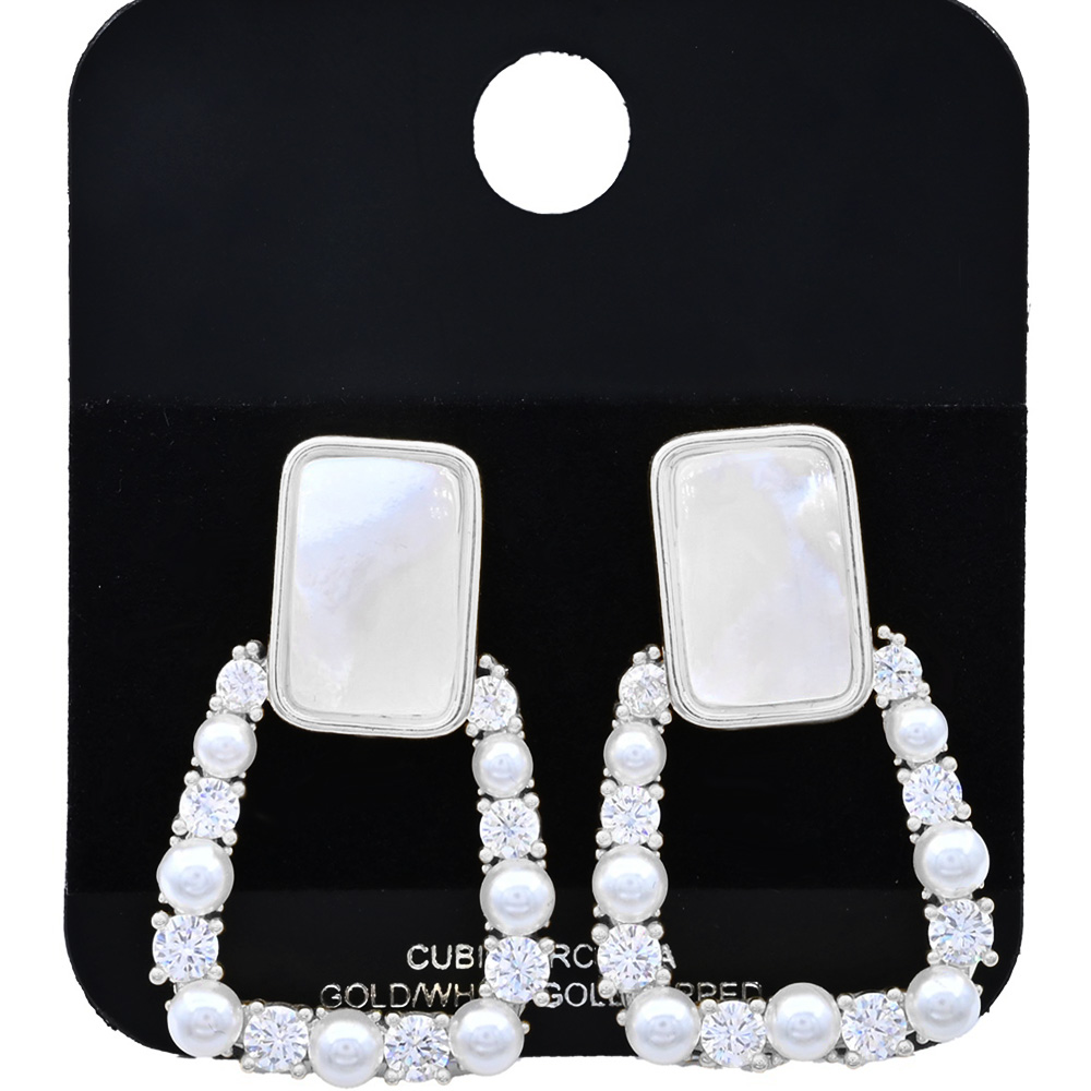 Details • Size : 0.75" X 1.2" • Post Back • Make a bold impression with these rectangular pearl and zircon statement earrings. Designed with refined sparkle and timeless sophistication, they are perfect for elevating both casual and formal outfits. A chic accessory for those who love standout elegance. • CZ Cubic Zirconia • Gold Dipped • Lead and Nickel Compliant