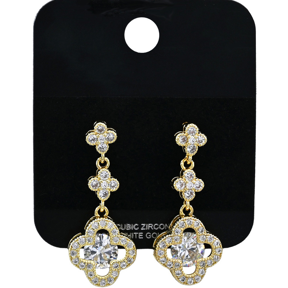 Details • Size : 0.6" X 1.25" • Post Back • Discover elegant cubic zirconia quatrefoil drop earrings designed with sparkling floral accents for a sophisticated look. Perfect statement jewelry for weddings, evening wear, or gifting. Add timeless sparkle and charm to your collection today. • CZ Cubic Zirconia • Gold Dipped • Lead and Nickel Compliant