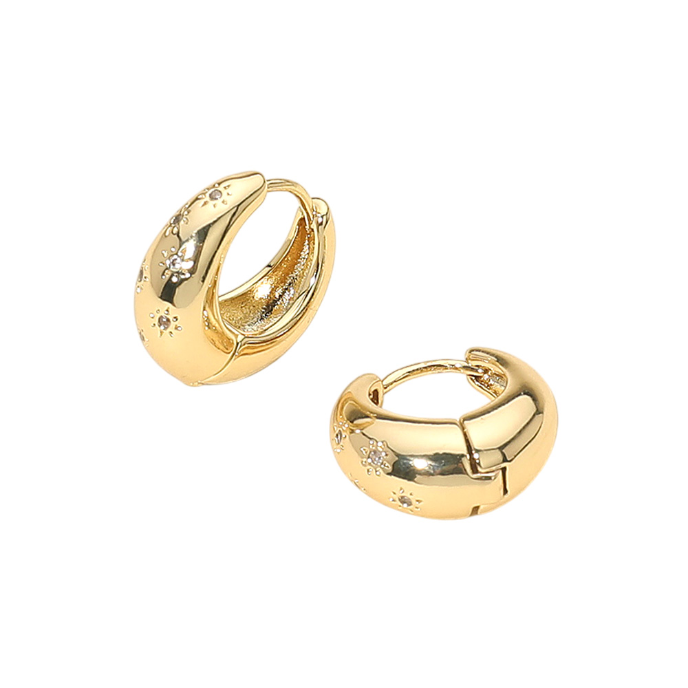Details • Size : 0.7" X 0.75" • Huggie Back • Elegant huggie hoop earrings adorned with sparkling CZ accents in delicate star designs. Their sleek, curved shape offers a chic yet timeless look, making them perfect for adding subtle shine to everyday outfits or elevating evening styles with refined elegance. • Brass • CZ Cubic Zirconia • Gold Dipped • Hypoallergenic • Lead and Nickel Compliant • Made In Korea