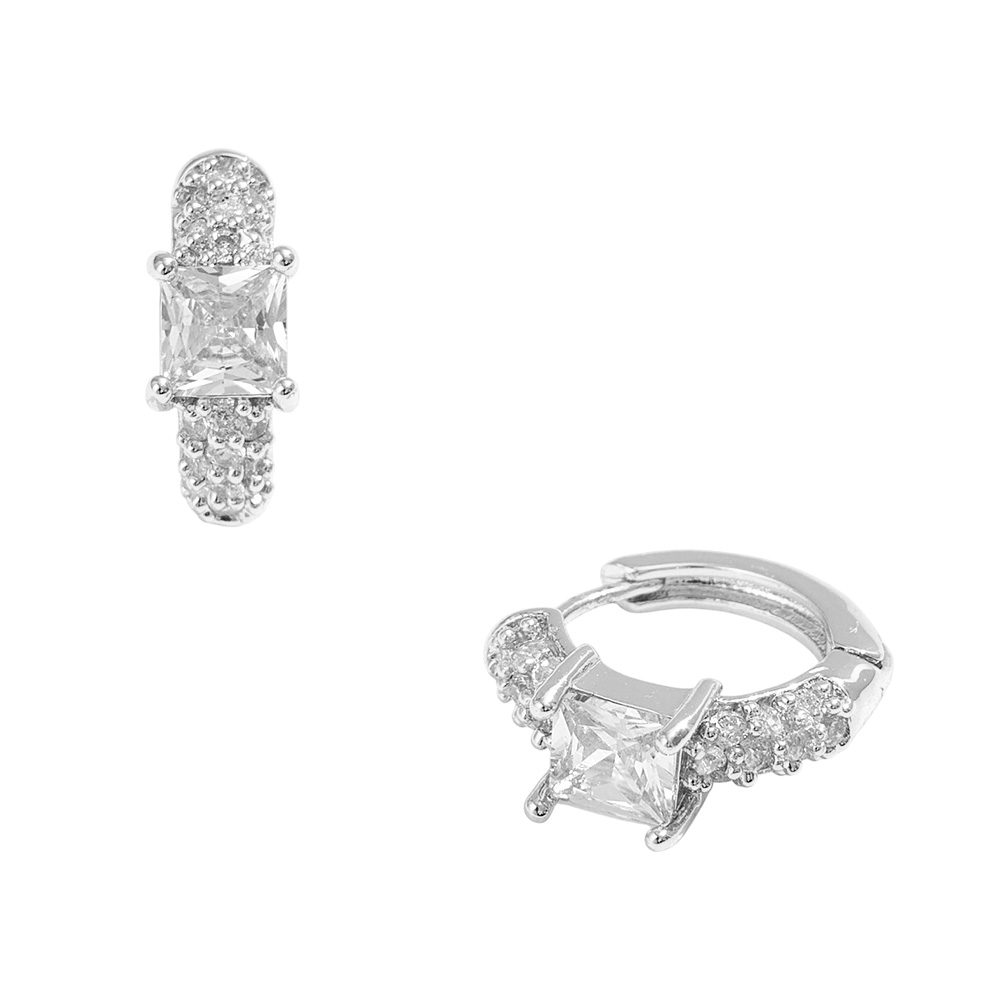 Details • Size : 0.6" X 0.5" X 0.25" • Huggie Back • These hoop earrings feature a bold square-cut CZ centerpiece framed with smaller sparkling stones, creating a look that is both glamorous and refined. Perfect for adding brilliance to your outfit, they offer timeless elegance with a modern twist for any occasion. • Brass • CZ Cubic Zirconia • Gold Dipped • Hypoallergenic • Lead and Nickel Compliant • Made In Korea