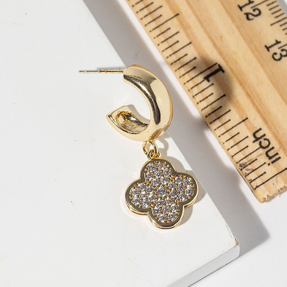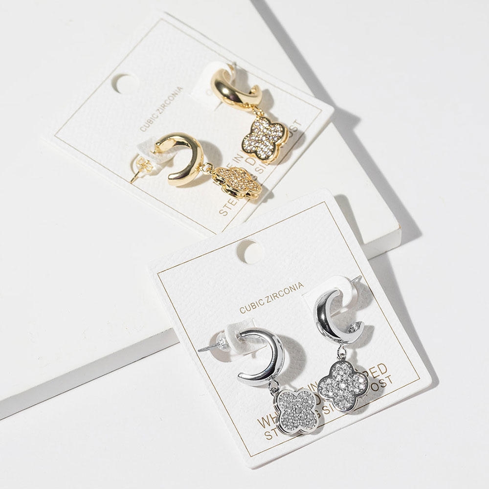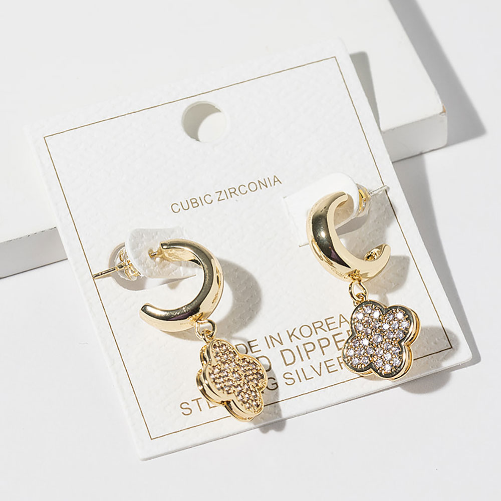Details • Size : 0.5" X 1.25" • Elegant crescent hoop earrings featuring a sparkling CZ quatrefoil charm that adds refined detail and soft movement. Designed to elevate everyday outfits or special looks, this timeless drop style offers a balanced blend of modern shape and classic charm, ideal for boutiques and curated accessory collections. • CZ Cubic Zirconia • Gold Dipped • Lead and Nickel Compliant • Made In Korea • Sterling Silver Post