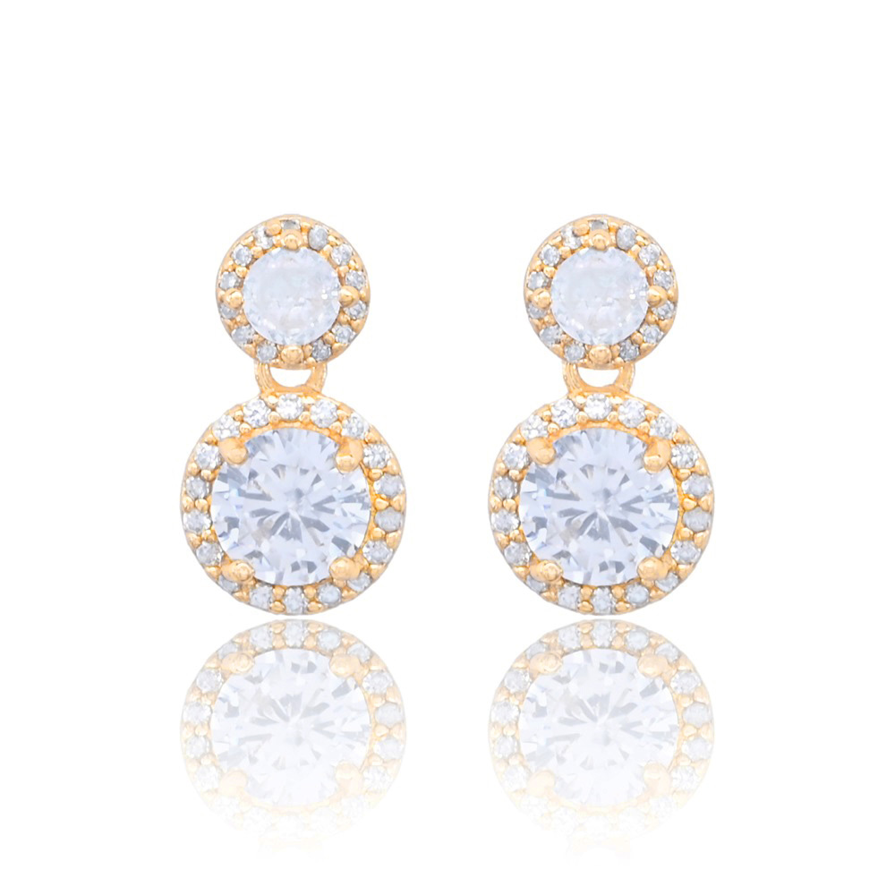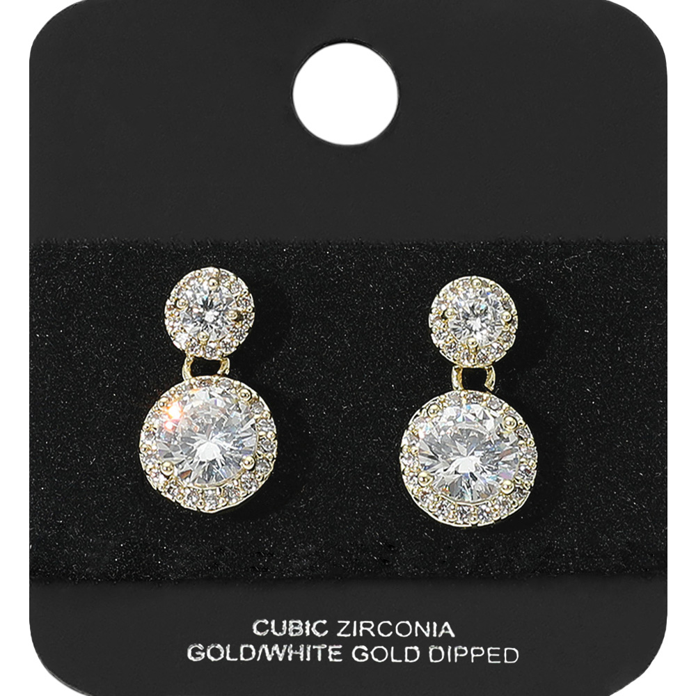 Details • Size : 0.4" X 0.7" • Post Back • Elevate your style with these double halo drop earrings featuring dazzling crystal accents. Designed with two graduated stones framed in shimmering details, they add a radiant finish to both day and evening looks, making them a timeless and versatile accessory. • CZ Cubic Zirconia • Gold Dipped • Lead and Nickel Compliant